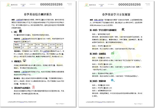 春笋英语教学系统通过摸底测评卷,精准分析学生的英语词汇水平,生成完整的学生摸底测评报告,并订制个人学习方案,以此作为后续个性化练习的生成依据。