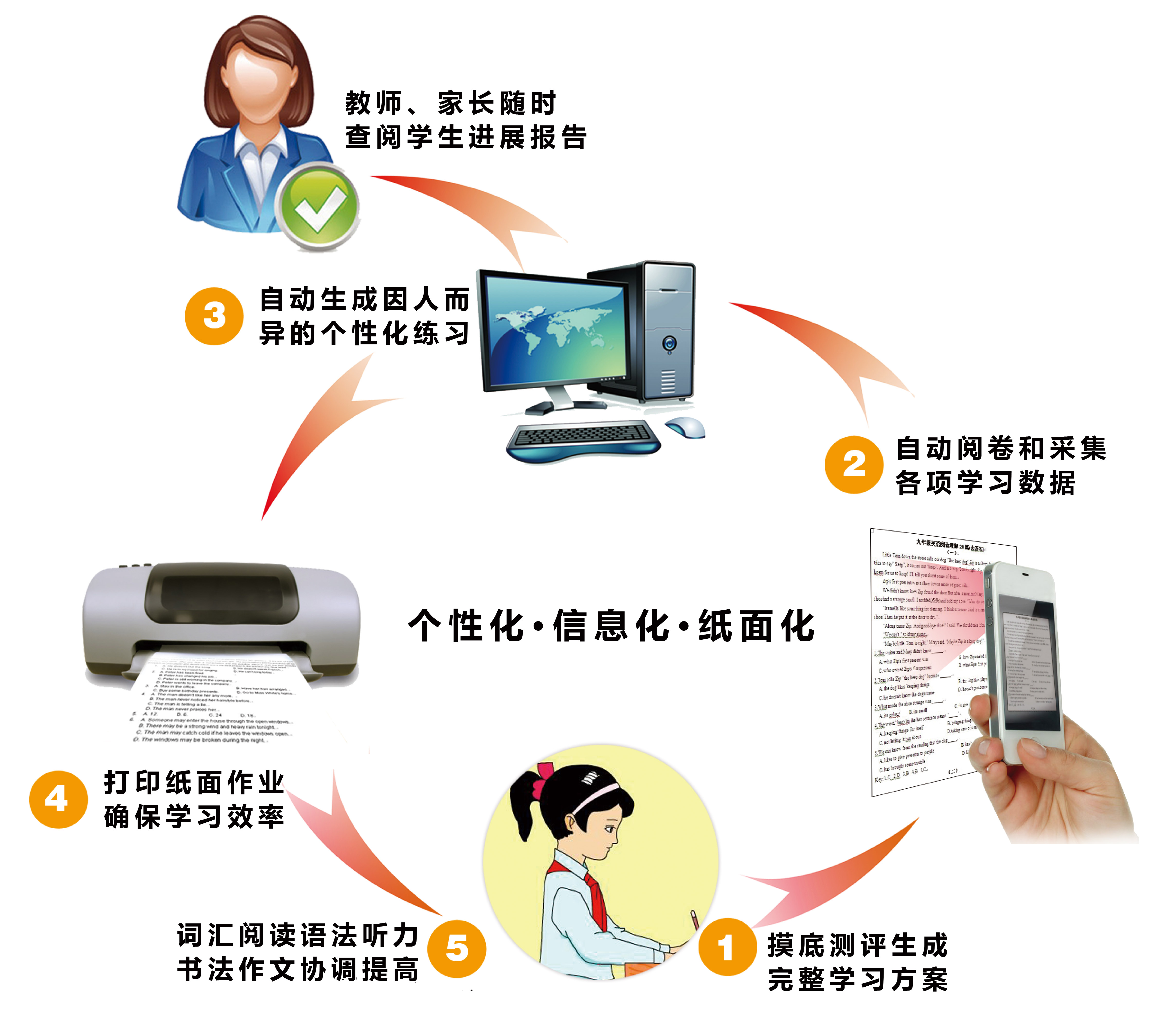 春笋英语教学系统为每名学生生成个性化练习,教学点打印后提供给学生,学生完成训练后,填写反馈表,由教学点将反馈表统一扫描上传,系统对反馈表进行分析,并更新学习数据。